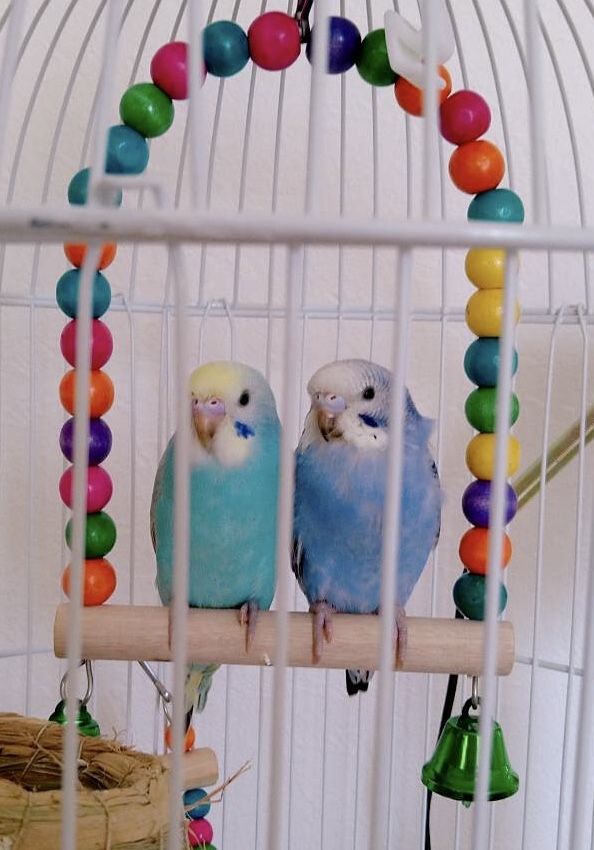左からアオちゃん、ピナちゃん(セキセイインコ生後3週間 性別不明)
