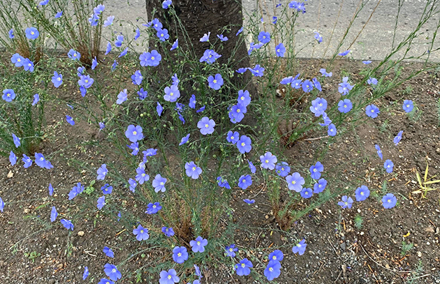 かつて東区の北8条通りには、麻の布を生産する「帝国製麻紡績工場」や「サッポロビール工場」などがありました。歴史にちなんだ「亜麻(アマ)とホップ」で界隈を飾り、地域のコミュニティを活性化したり、にぎわいを目指すために、AMAサポーターズクラブが、地元町内会みなさんの協力を得て北8条通りなどの歩道の「植樹ます」に植栽しています。多年草の亜麻は今年も葉を茂らせ、色鮮やかな青紫の花が一斉に咲き、街角を明るく彩りました。